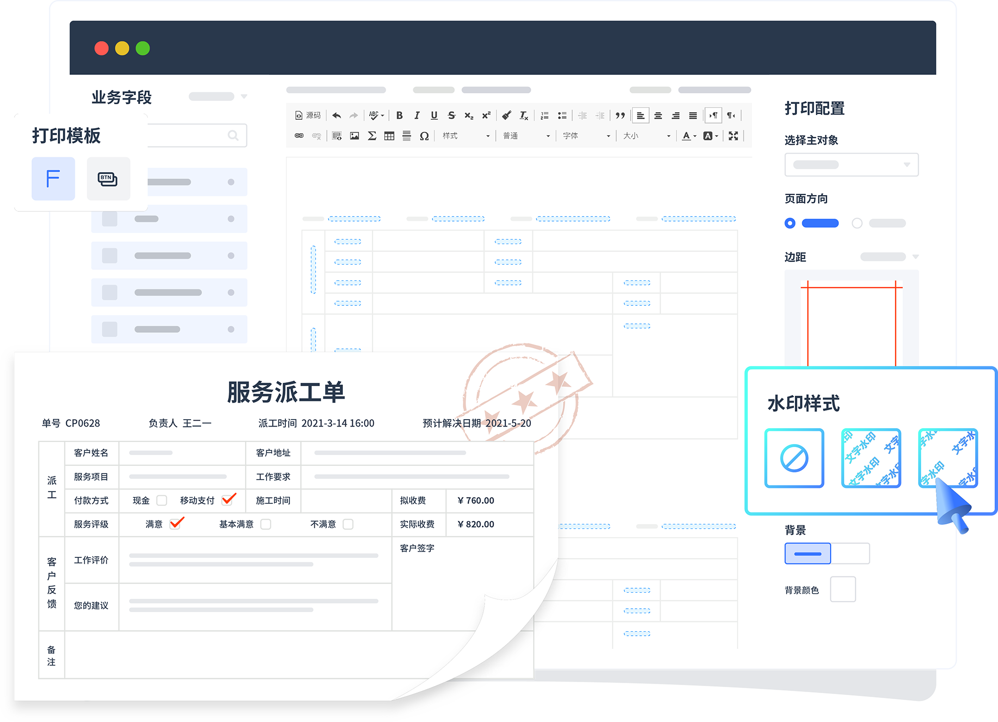 业务场景所需的打印/输出文档也支持自定义,关联系统内数据支持水印等辅助配置。